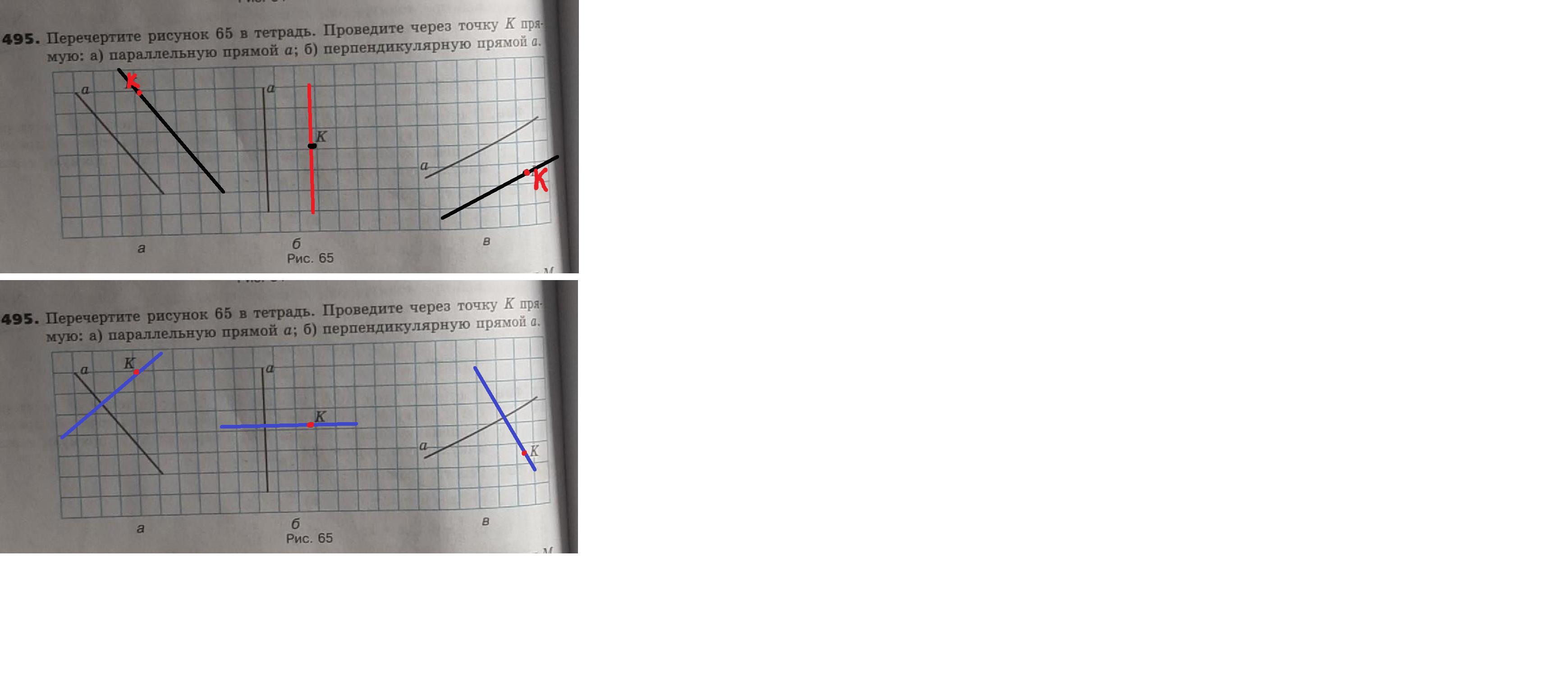 495. Перечертите рисунок 65 в тетрадь. Проведите через точку К пря-