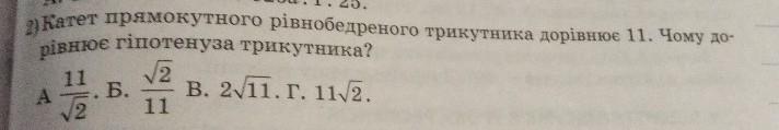 Треугольник равнобедренный, значит его стороны равны. То есть, сторона а, b (например) 11, нам нужно найти гипотенузу с (например)