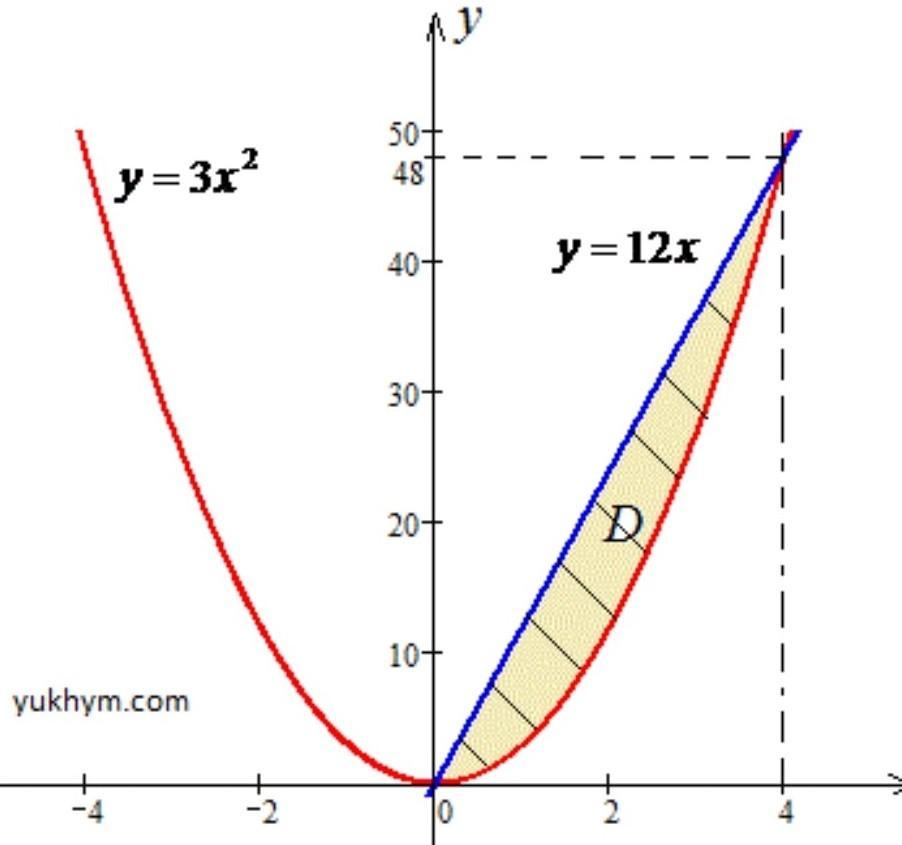 В этом примере "игрек" изменяется от нижней кривой (параболы) к верхней (прямой), в это время "икс" пробегает значение от 0 до 4.