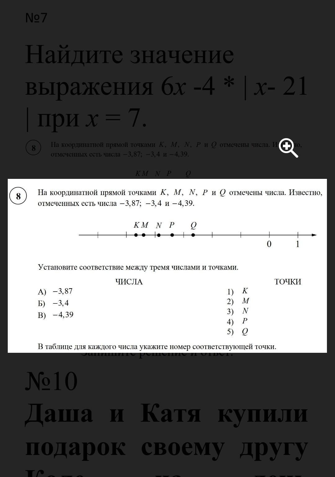 Пошаговое объяснение:Вот смотри,отрезок равен 1,Q находится в промежутке от -3 до -2,следовательно нам не подходит.Далее идёт P,в свою очередь он находится ближе к -3,нежели N.Таким образом,P имеет значение -3,4.После него идет N,который будет равен -3,87,ведь он чуть дальше находится,чем P.Далее идёт отрезок от -5 до -4.M ,в свою очередь,находится ближе к -4,тем самым нам подходит и приобретает значение -4,39.Вот так вот.