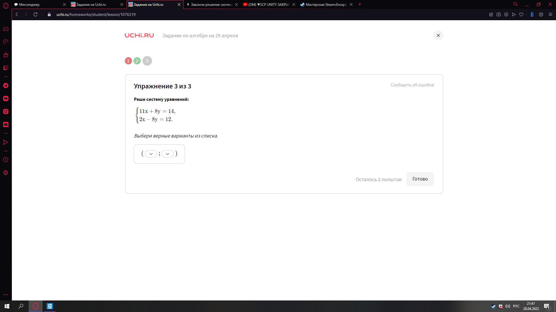 подставляем ч в любое уравнение (я подставил в 1) и получаем 22+8у=14