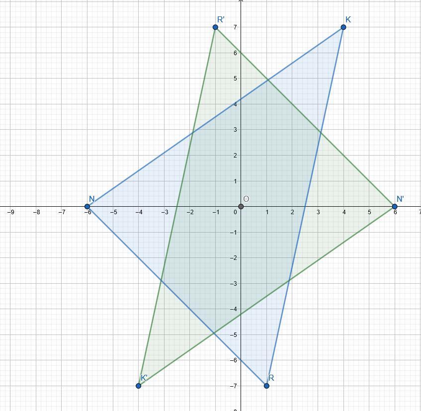 Нарисуй треугольник симметричный ему треугольник k1,N1,R1. Относительно начала координатной системы , определи координаты вершин симметричного треугольника