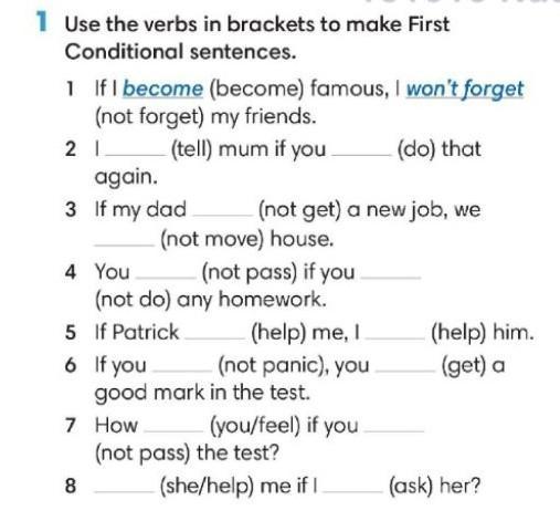 Відповідь:1. i will tell mum if you do that again 2. if my dad doesn’t get a new job, we will not move house 3. you will not pass if you don’t do any homework 4. if Patrick help me, i will help him 5. if you don’t panic, you will get a good mark in the test 6. how you will be feel if you don’t pass the test? 7. will she help me if i ask her?