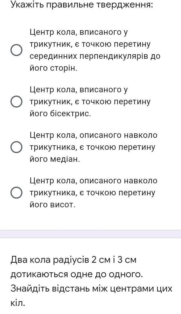 Центр кола,вписаного у трикутник ,є точкою перетину серединних перпендикулярів до його сторін