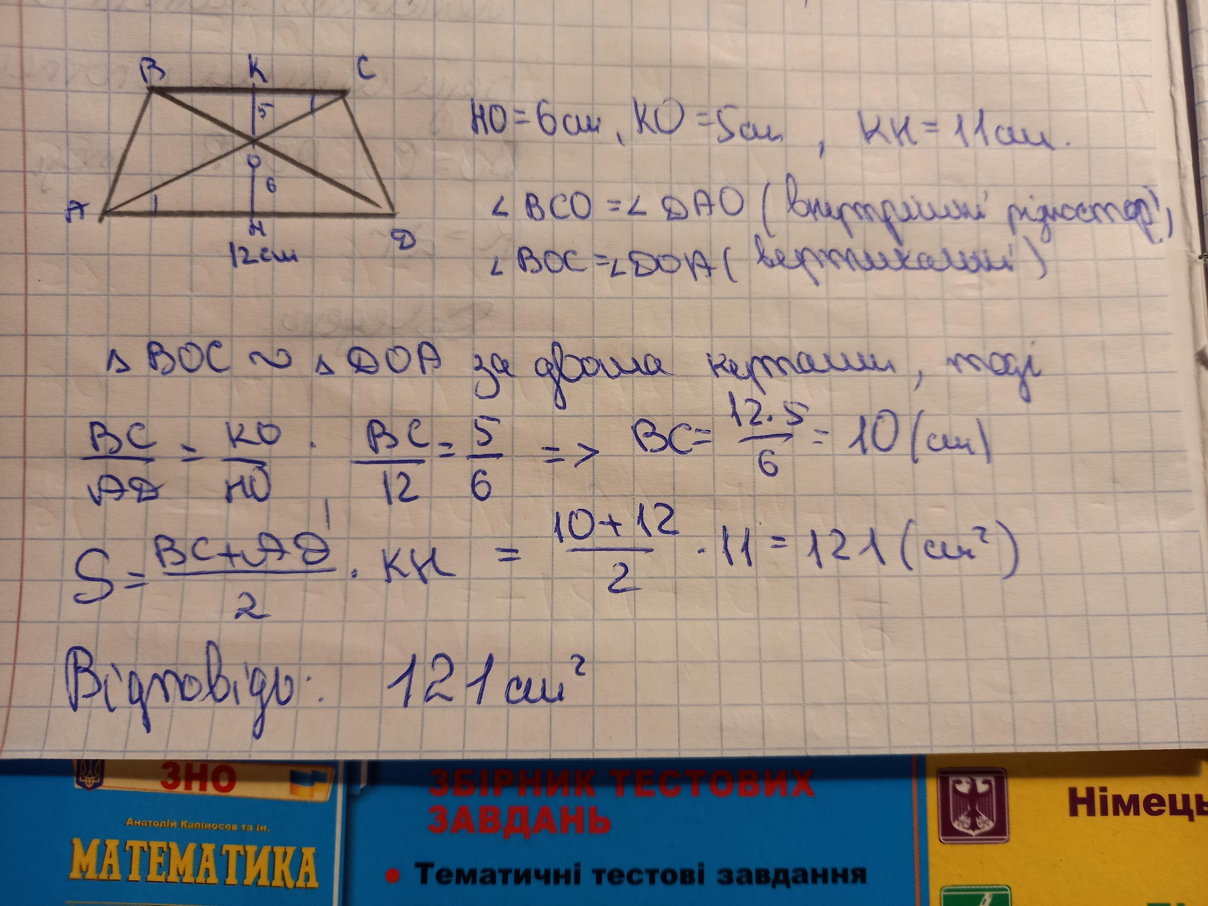 діагоналей трапеції віддалена від основ на 6 см і 5 см. Знайдіть плошту