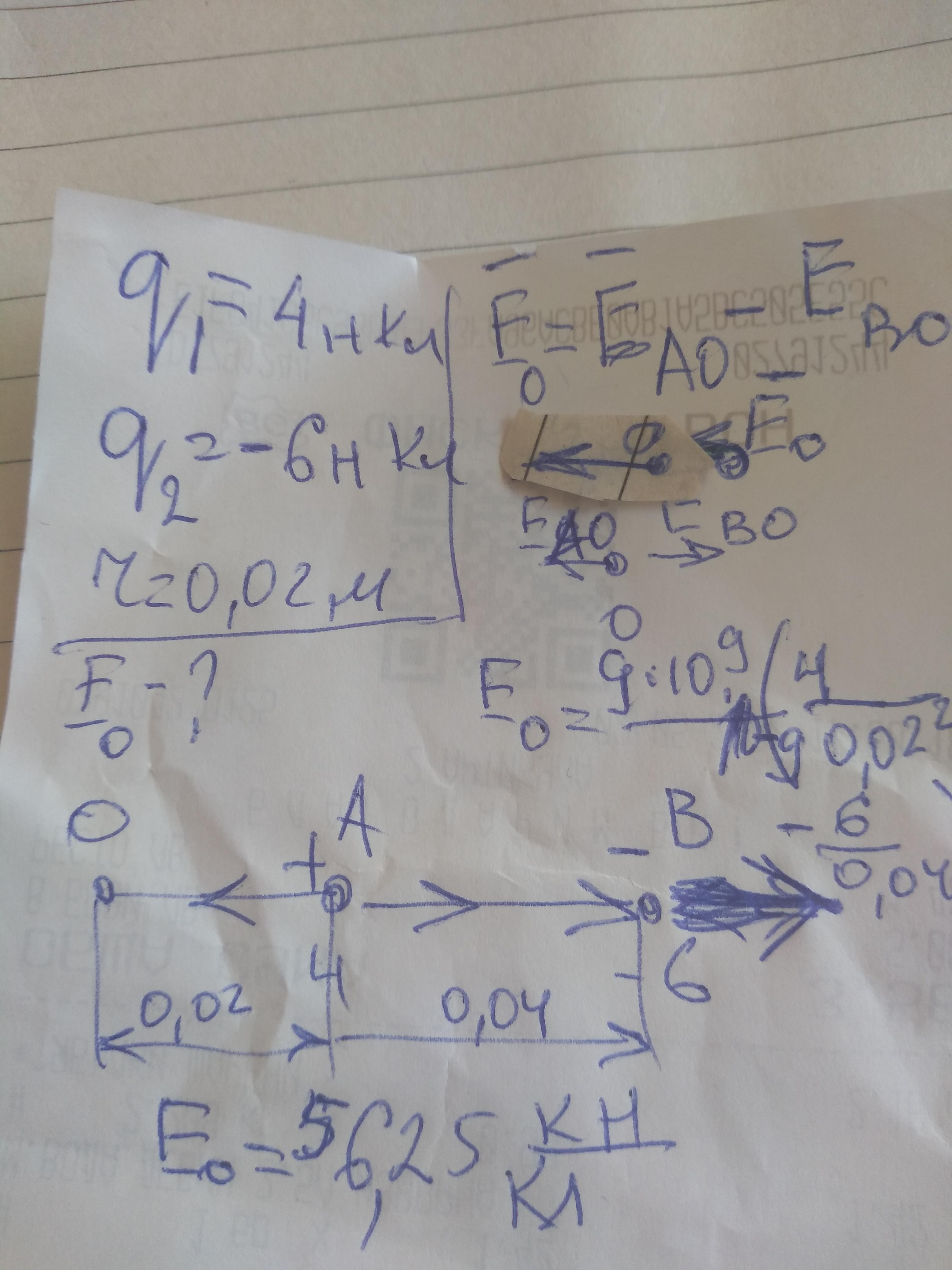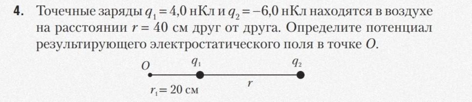 Точечные заряды q, = 4,0 нКл и q2 = -6,0 нКл находятся в воздухе на расстоянии r = 40 см друг от друга. Определите потенциал результирующего электростатического поля в точке О. r=20 cm