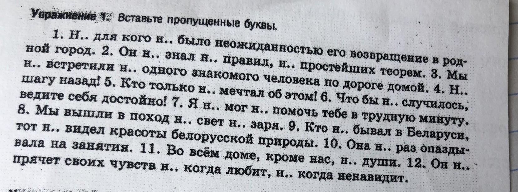 1. Н.. для кого н.. было неожиданностью его возвращение в род- ной город. 2. Он н.. знал н.. правил, н.. простейших теорем. 3. Мы н.. встретили н.. одного знакомого человека по дороге домой. 4. Н.. шагу назад! 5. Кто только н.. мечтал об этом! 6. Что бы н.. случилось. ведите себя достойно! 7. Я н.. мог н.. помочь тебе в трудную минуту. 8. Мы вышли в поход н.. свет н.. заря. 9. Кто н.. бывал в Беларуси, тот н.. видел красоты белорусской природы. 10. Она н.. раз опазды- вала на занятия. 11. Во всём доме, кроме нас, н.. души. 12. Он н.. прячет своих чувств н.. когда любит, н.. когда ненавидит