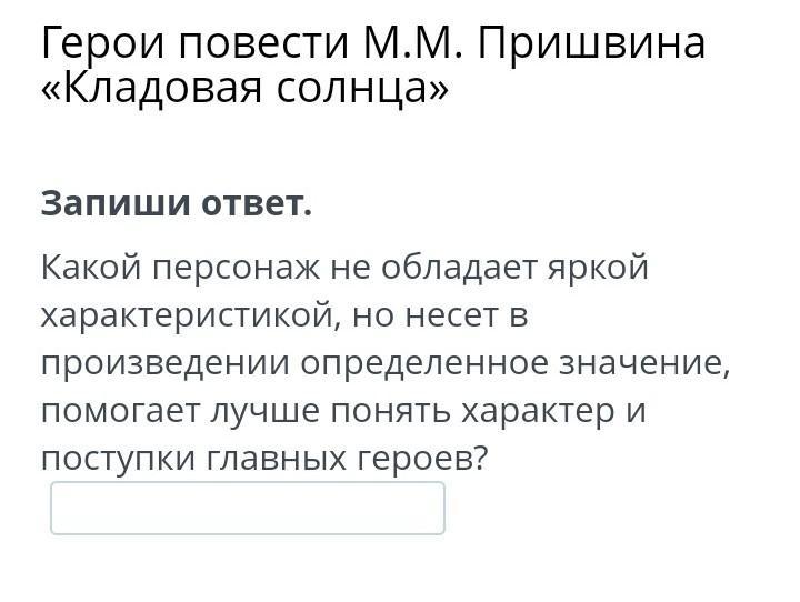 Герои повести М.М. Пришвина «Кладовая солнца» Запиши ответ. Какой персонаж не обладает яркой характеристикой, но несет в произведении определенное значение, помогает лучше понять характер и поступки главных героев?