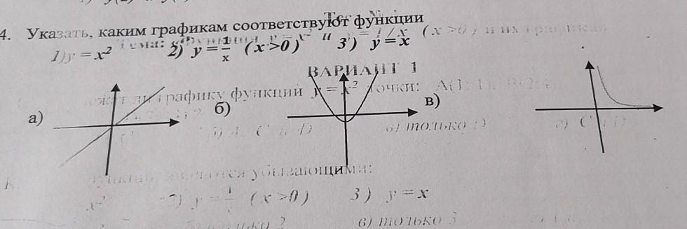 б) здесь изображён график параболлы. При смещении она имеет формулу y=(x-b)²+c, а при отсутствии смещения - формулу y=x². В данном случае на графике у неё есть смещение, однако функция смещения не имеет. Выбираем y=x² от безысходности.