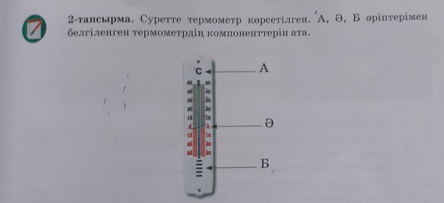 2-тапсырма. Суретте термометр көрсетілген. А, Ә, Б әріптерімен белгіленген термометрдің компоненттерін ата. Помогите.