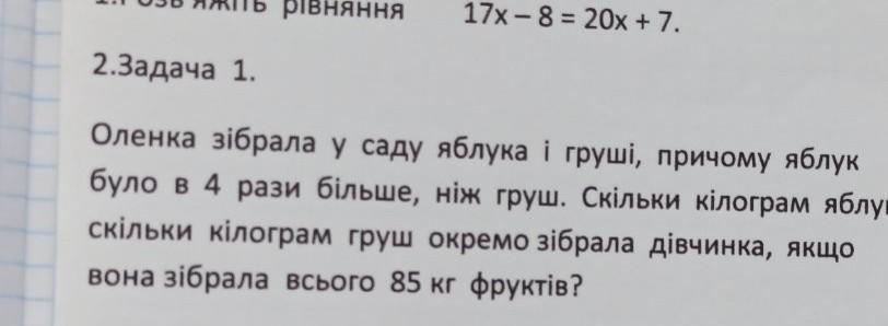 Оленка зібрала у саду яблука і груші, причому яблук було в 4 рази більше, ніж груш. Скільки кілограм ябл скільки кілограм груш окремо зібрала дівчинка, якщо вона зібрала всього 85 кг фруктів?