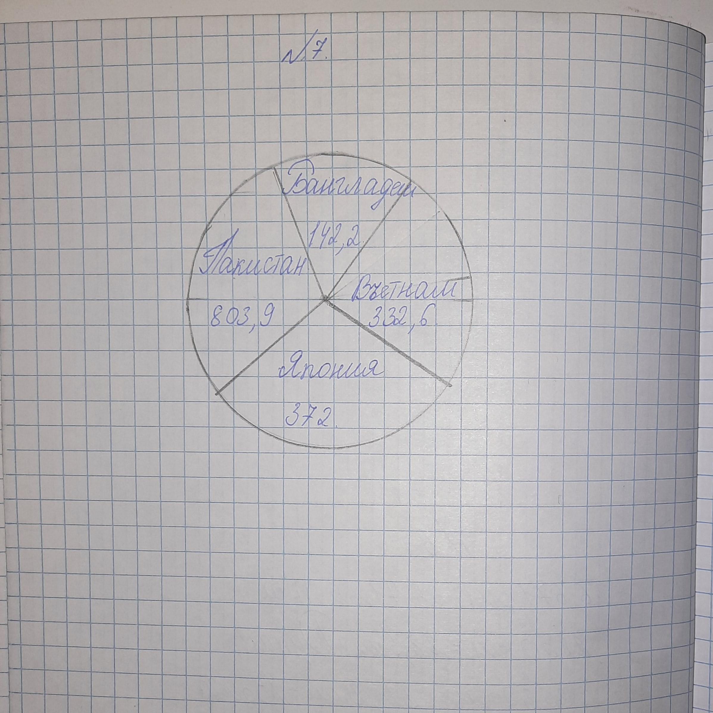 7. На таблице даны площади некоторых азиатских стран в тысячах квадратных километров. Площадь (1000 км²) Имя страны Пакистан Бангладеш Япония 803,9 142,2 372 Въетнам 332,6 Сравните площади этих стран с помощью круговой диаграммы.
