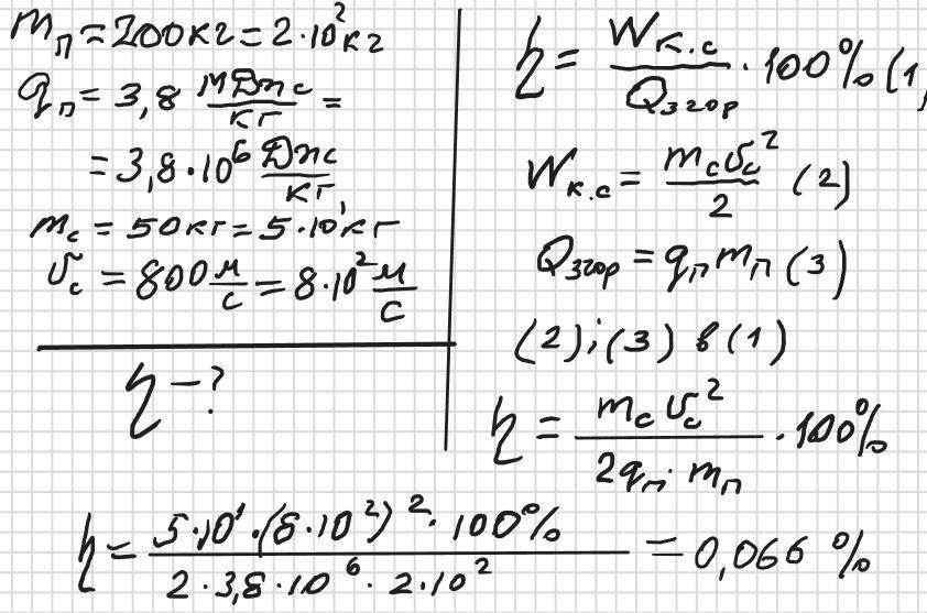 Під час пострілу з грамати сгоряє 200 кг пороху,маса снаряду 50 кг,а швидкість вильоту з стволу 800м/с. Визначте ККД грмати?