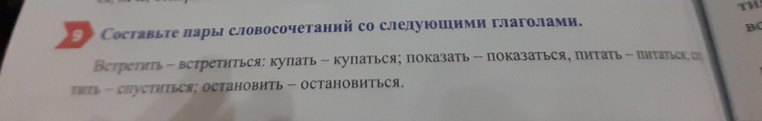 Встретить друга, встретиться с знакомым, купать брата/сестру, купаться в ванной, показать одежду, показаться грубым, питать ненависть, питаться супом, спустить штаны, спуститься с лестницы, остановить машину, остановиться на светофоре