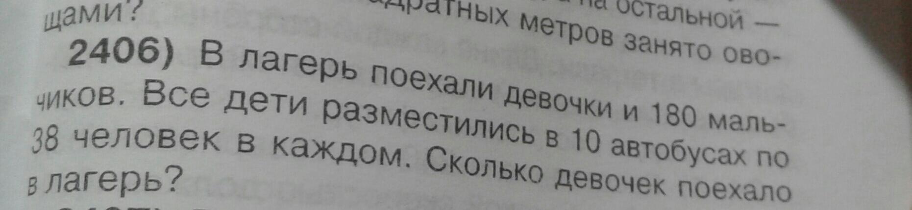 Тебе нужно 38*10 чтобы узнать сколько всего поехало детей а потом 180 мальчиков вычесть и ты получишь сколько поехало девочек