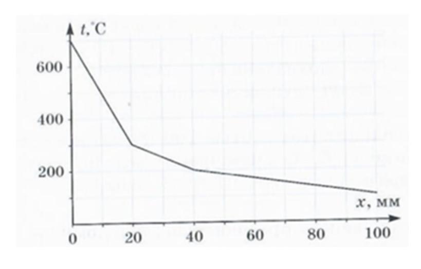 Железный цилиндрический пруток длиной 10 см и массой 15 г нагрели в пламени газовой горелки. Распределения температуры по длине прутка приведена на рисунке. Через некоторое время температура прутка выровнялась и составила 200 С. Оцените, какое количество теплоты потерял за это время пруток. Ответ дать в Дж, округлив до целых.