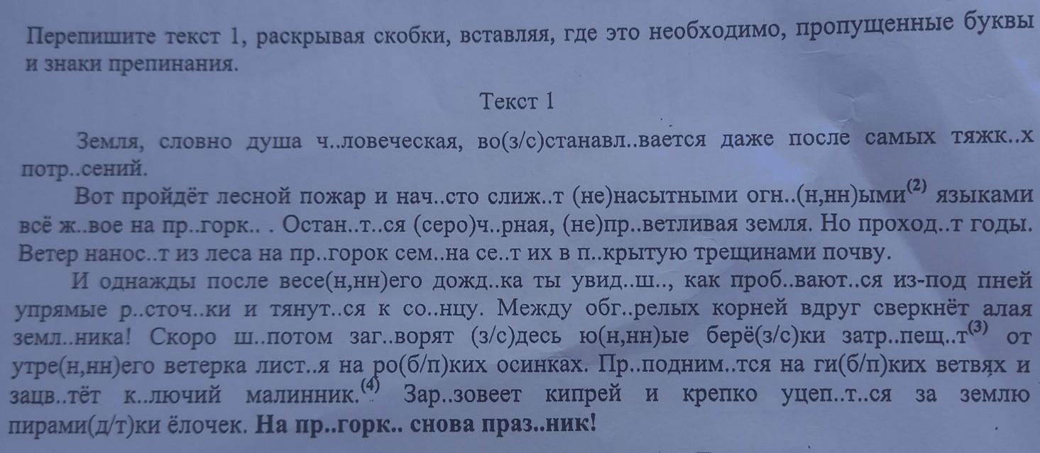 1 Перепишите текст 1, раскрывая скобки, вставляя, где это необходимо, пропущенные буквы и знаки препинания. Текст 1 Земля, словно душа ч..ловеческая, во(з/с)станавл..вается даже после самых тяжк..х потр..сений. (2) Вот пройдёт лесной пожар и нач..сто слиж..т (не)насытными огн..(н,нн)ыми языками всё ж..вое на пр..горк... Остан..т..ся (серо)ч..рная, (не)пр..ветливая земля. Но проход..т годы. Ветер нанос..т из леса на пр..горок сем..на се..т их в п..крытую трещинами почву. И однажды после весе(н,нн)его дожд..ка ты увид..ш.., как проб..вают..ся из-под пней упрямые р..сточ..ки и тянут..ся к со..нцу. Между обг..релых корней вдруг сверкнёт алая земл..ника! Скоро ш..потом заг..ворят (з/с)десь ю(н,нн)ые берё(3/с)ки затр..пещ..т(3) от утре(н,нн)его ветерка лист..я на ро(б/п)ких осинках. Пр..подним..тся на ги(б/п)ких ветвях и зацв..тëт ключий малинник. Зар..зовеет кипрей и крепко уцеп..т..ся за землю пирами(д/т)ки ёлочек. На пр..горк.. снова праз..ник!