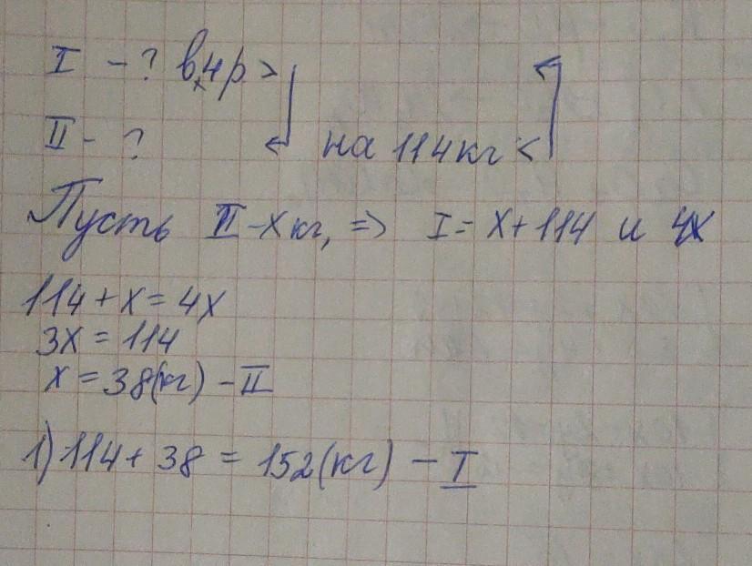 Скласти рiвняння і розв'язати задачу. У магазині продали картоплю за два дні, причому за перший день продали у 4 рази більше картоплi, нiж за другий. Скільки картоплі продали за кожен день, якщо за лругий день продали на 114 кг менше, ніж за перший?
