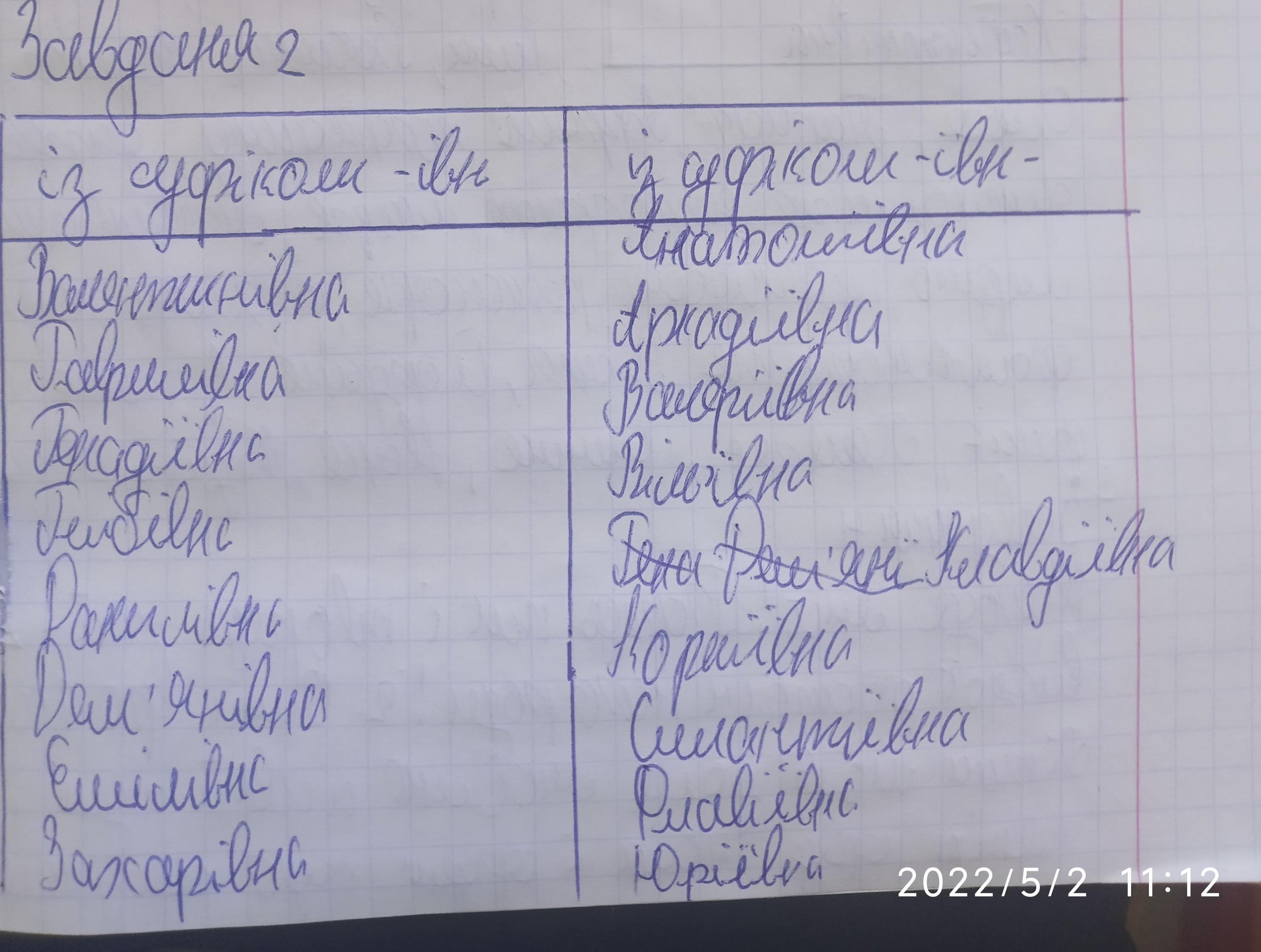 Завдання 2. Від поданих імен утворіть жіночі імена по батькові й запишіть їх до відповідної колонки таблиці. Обґрунтуйте свій вибір (2 бали)