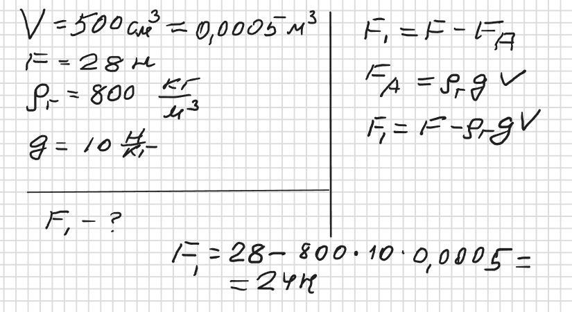 вантаж об'ємом 500 см кубічних підвішено до динамометра, що показує 28. Скільки покаже динамометр якщо вантаж опустити в гас