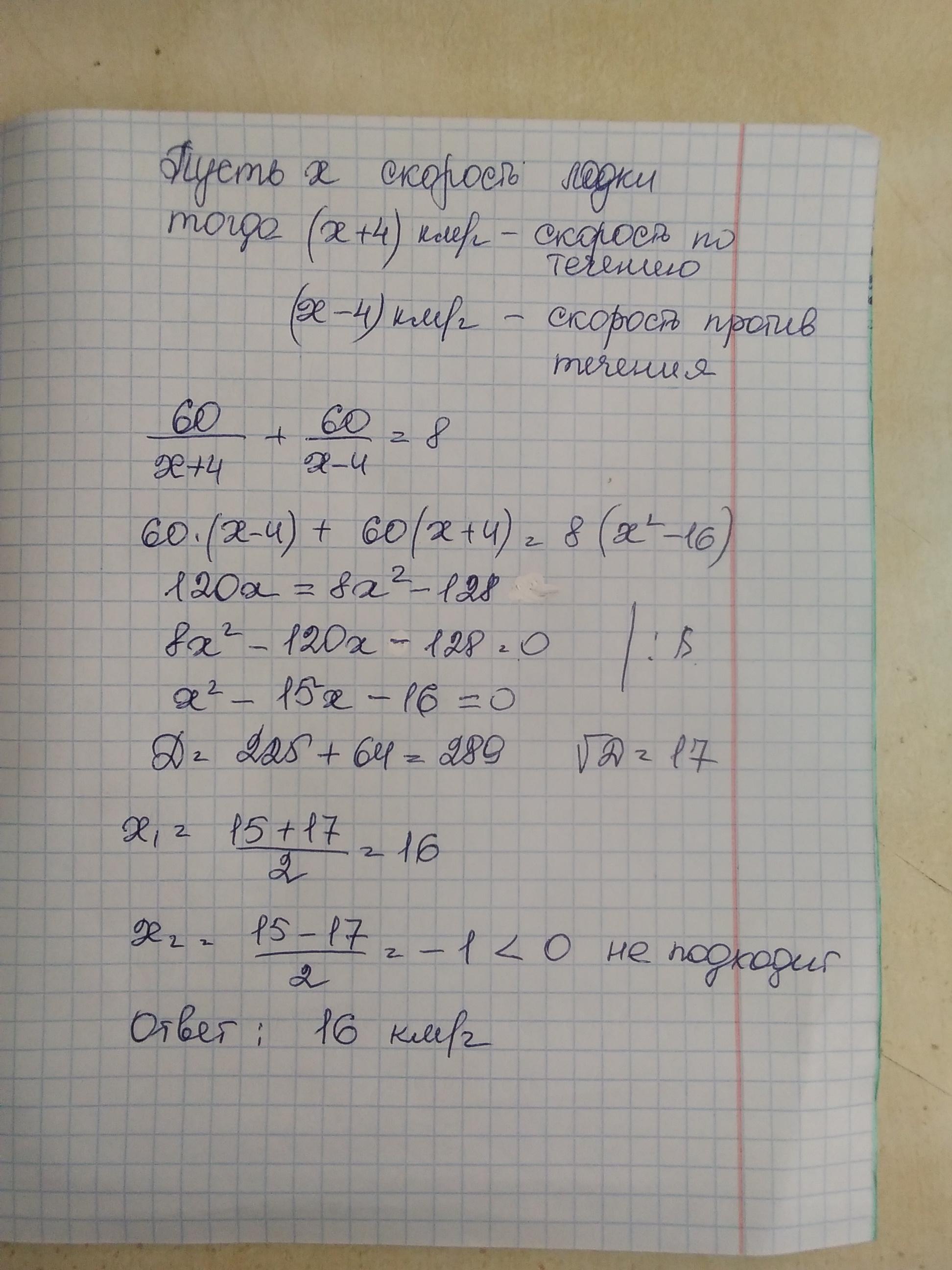 Моторная лодка проехала 60 км по течению реки и вернулась обратно. Весь путь длился 8 часов. Найдите скорость моторной лодки в неподвижной воде, если скорость течения реки равна 4 км/ч.