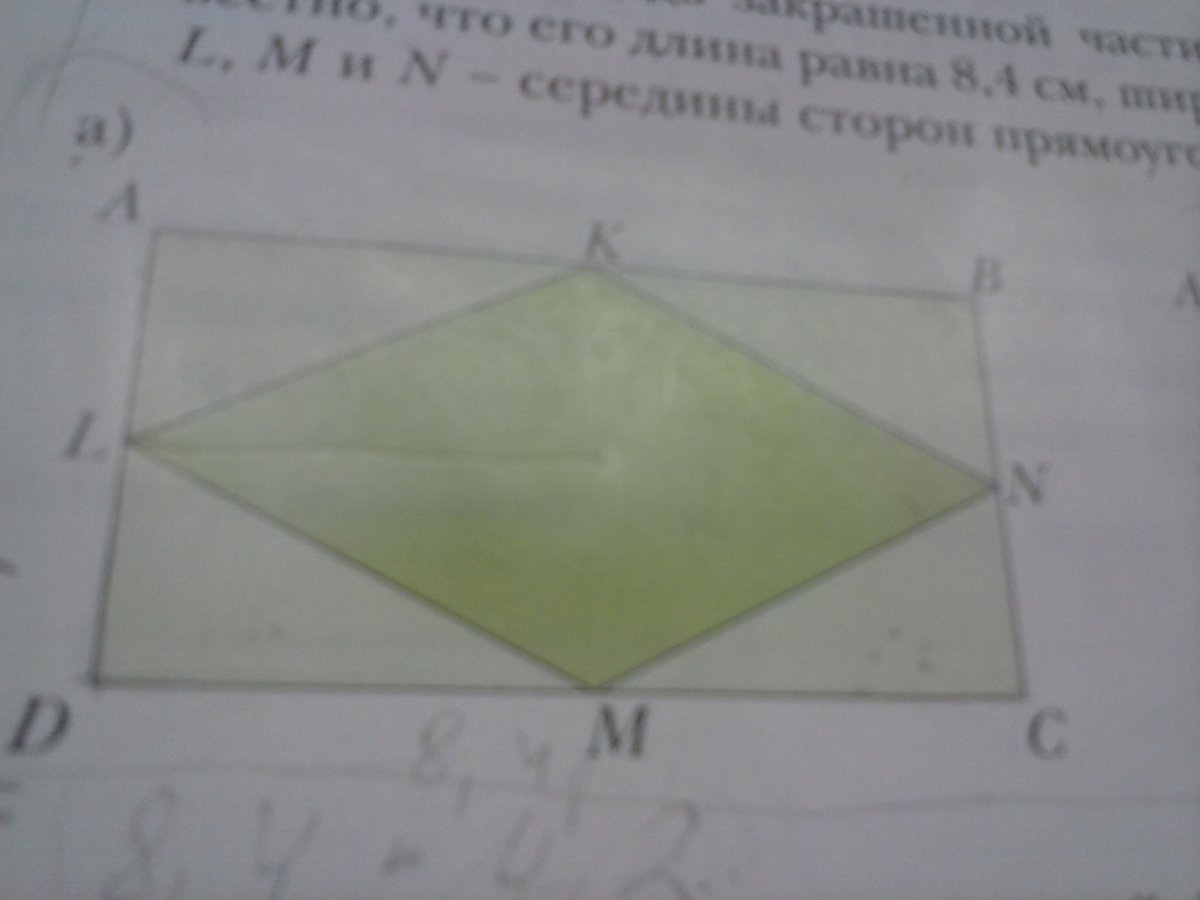 Вычисли площадь закрашенной части прямоугольника, если известно, что его длина равна 8.4 см, ширина равна 4.2 см и точки К, L, М и N - середины сторон прямоугольника.