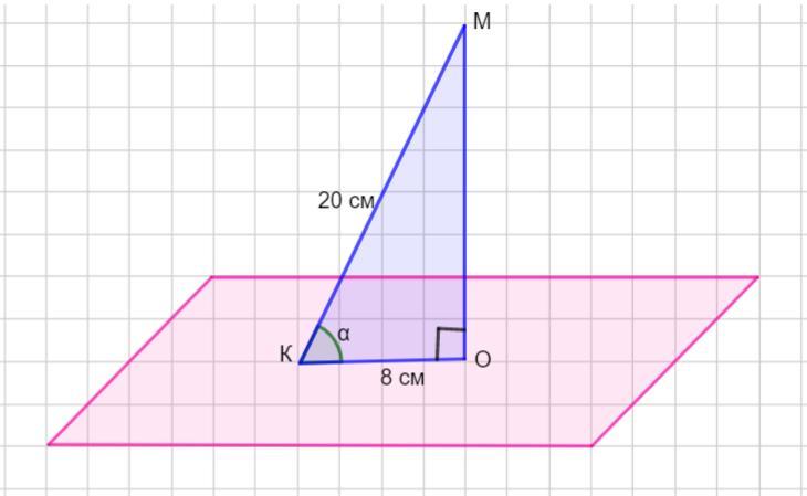 По условию наклонная МК = 20 см, проекция наклонной КО = 8 см.