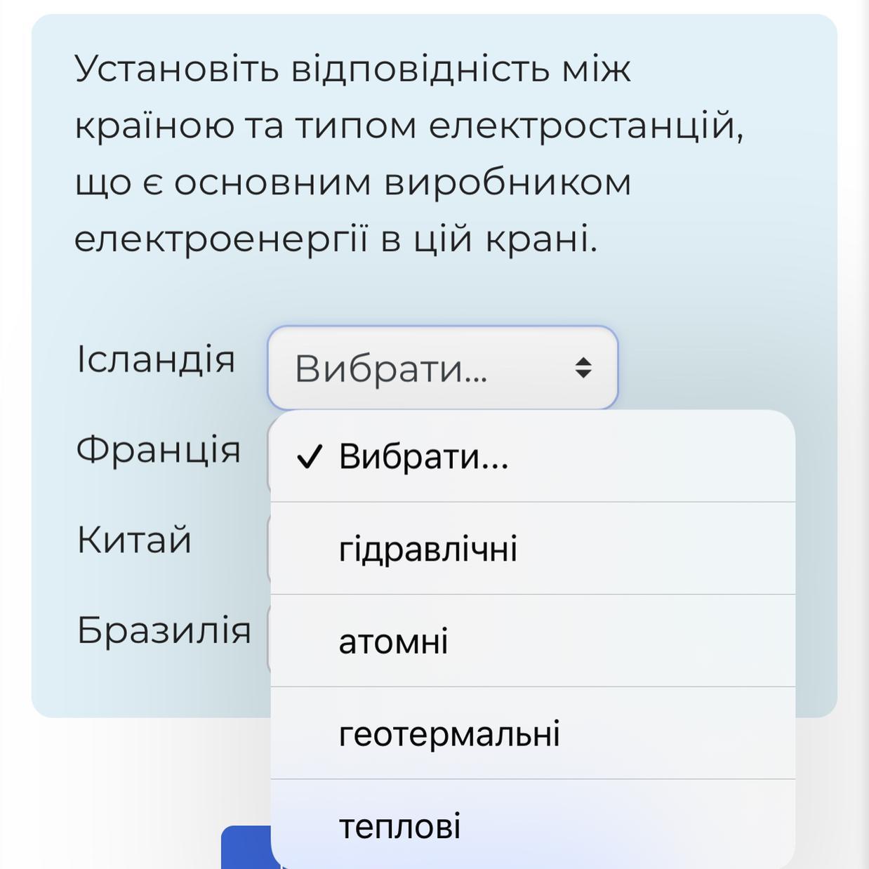 Установіть відповідність між країною та типом електростанцій, що є основним виробником електроенергії в цій крані.