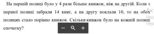на второй полке было х книг, на первой 4х, с первой забрали 14, стало 4х-14, на вторую поставили 10, стало х+10