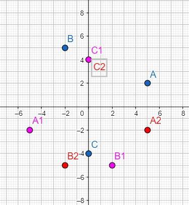 1. Побудувати точки, симетричні точкам А(5;2), В(-2;5), С(0;-4) а) відносно початку координат;