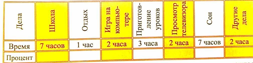 В таблице представлена информация о том, чем занимался школьник в течение дня. Заполните таблицу, выразите в процентах время, подсчитано и на каждое занятие школьника. По таблице составьте несколько вопросов.