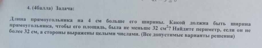 4. (4балла) Задача: Длина прямоугольника на 4 см больше его ширины. Какой должна быть ширина прямоугольника, чтобы его площадь, была не меньше 32 см²? Найдите периметр, если он не более 32 см, а стороны выражены целыми числами. (Все допустимые варианты решения)