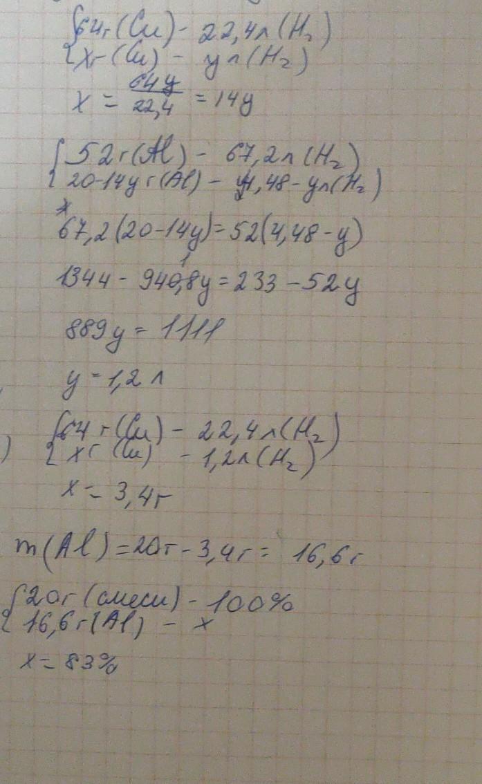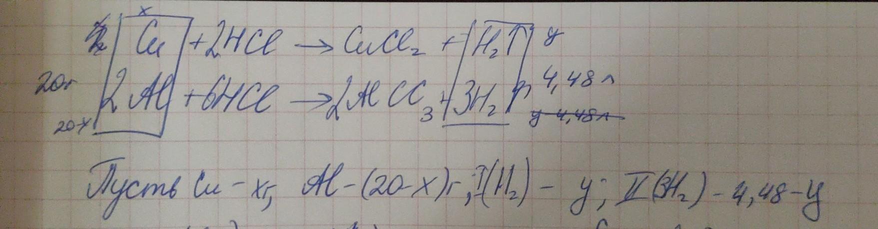 На сплав масою 20 г, що складається з міді і алюмінію, подіяли розчином хлоридної кислоти. При цьому виділилося 4,48 л водню. Знайдіть масову частку алюмінію у сплаві (у %).