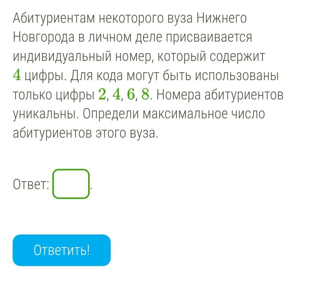 Абитурентам некоторого вуза Нижнего Новгорода в личном деле присваивается индивидуальный номер, который содержит 4 цифры. Для кода могут быть использованы только цифры 2,4,6,8. Номера абитуриентов уникальны. Определите максимальное число абитуриентов этого вуза.