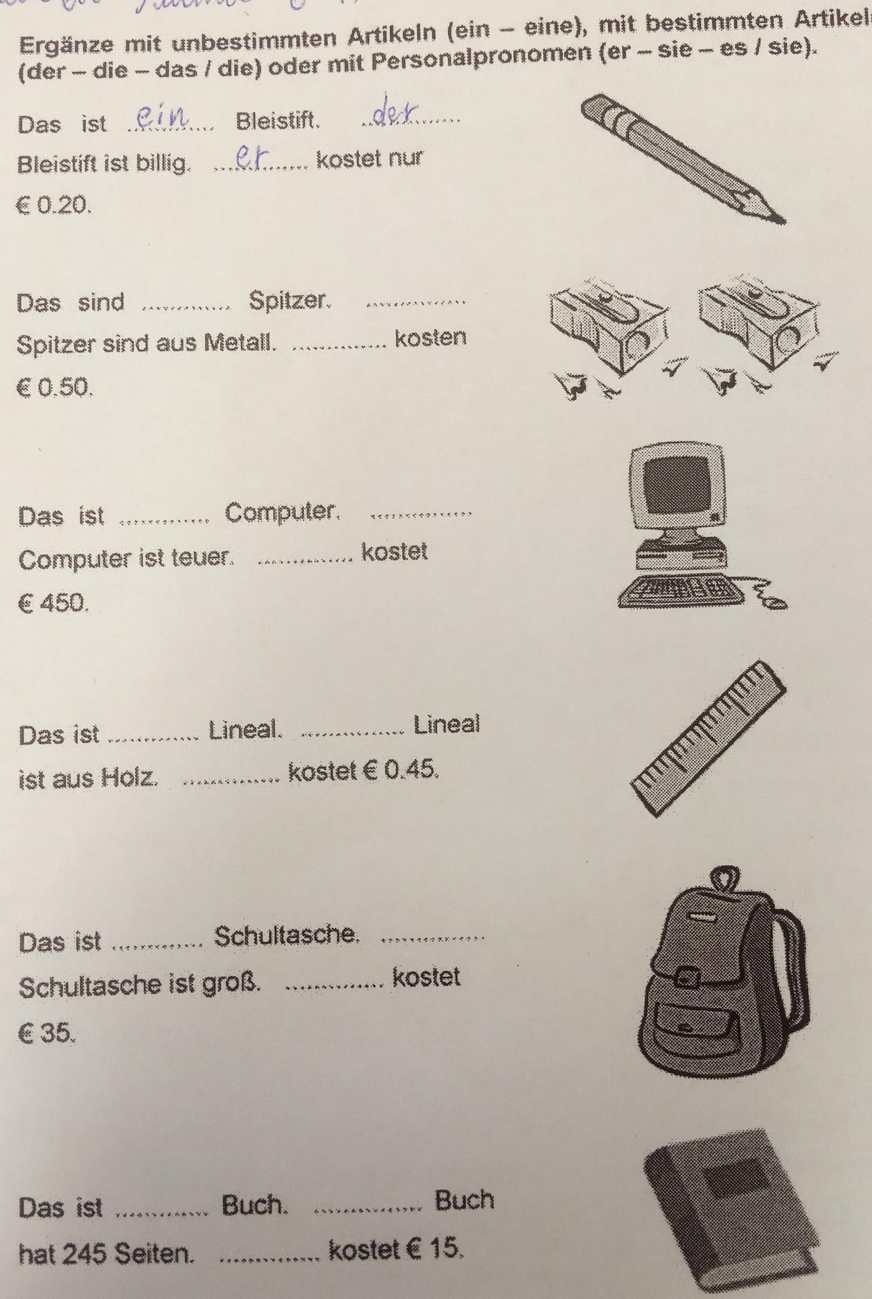 Das ist eine Schultasche. Die Schultasche ist groß. Sie kostet 35 Euro.