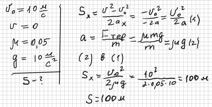 Велосипедист рухається зі швидкістю 10 м/с. Який шлях він проїде по горизонтальній ділянці шляху, після того як перестане обертати педалями. Коефіцієнт тертя 0,05. (g=10м/с2)