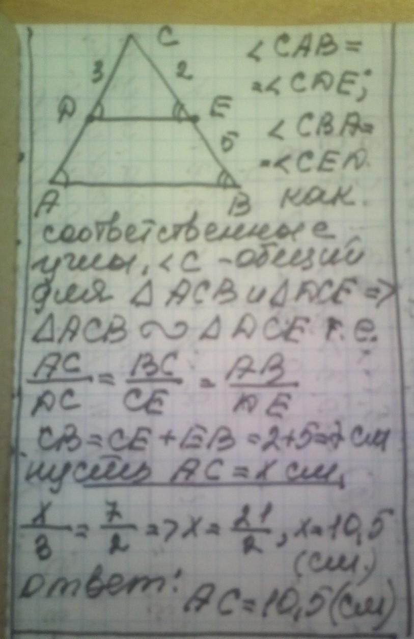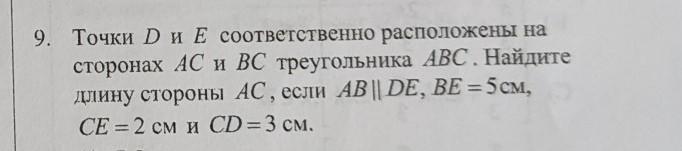 Точки D и E соответственно расположены на сторонах АС и ВС треугольника АВС. Найдите длину стороны АC, если AB|| DE, BE =5cm, CE = 2 см и CD=3 см.