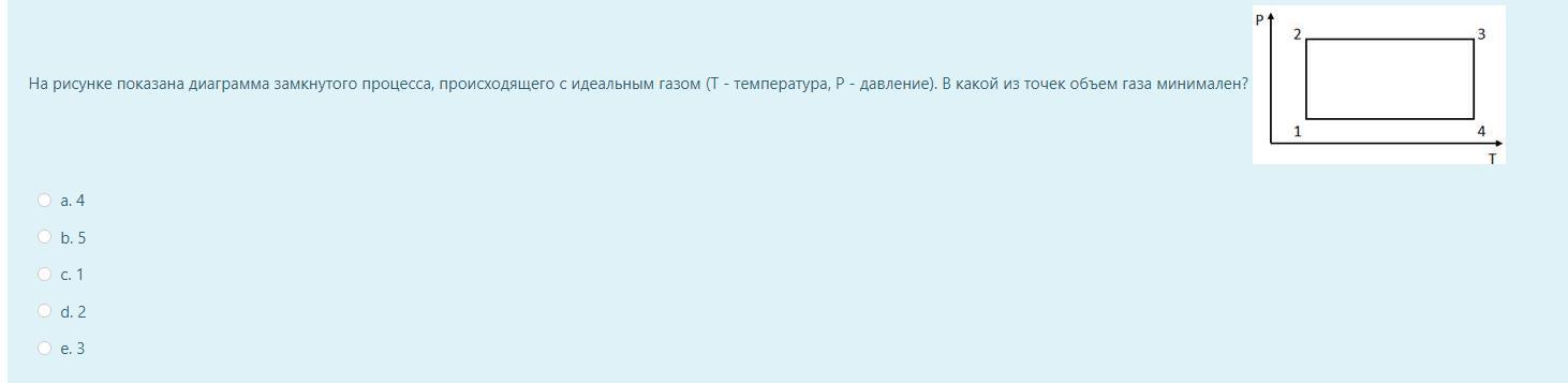 На рисунке показана диаграмма замкнутого процесса, происходящего с идеальным газом (T - температура, P - давление). В какой из точек объем газа минимален?