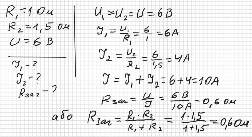 Обчисліть силу струму , що проходить через перший другий резистори , опори яких 1 Ом та 1.5 Ом відповідно , якщо вони з'єднані паралельно та підключенi до джерела з напругою 6 В та загальний опір такого з'єднання через лампочку , опір якої 2 Ом , проходить струм З А.