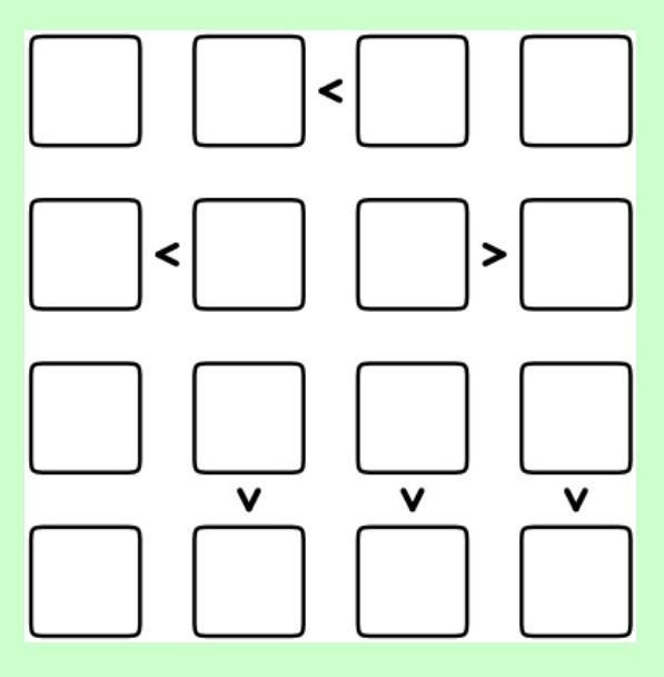 Заполните клетки числами 1, 2, 3, 4, учитывая знаки неравенства так, чтобы в каждой строке и в каждом столбце каждое число было записано один раз. Какое число будет записано в верхней строке в угловой клетке слева? Сравнивать следует однозначные числа 1 ,2 ,3, 4, которые в соседних клетках.