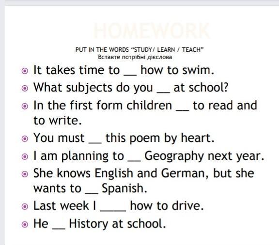 8)study/teach (не уверен что из них, по идее и то, и другое подходит)