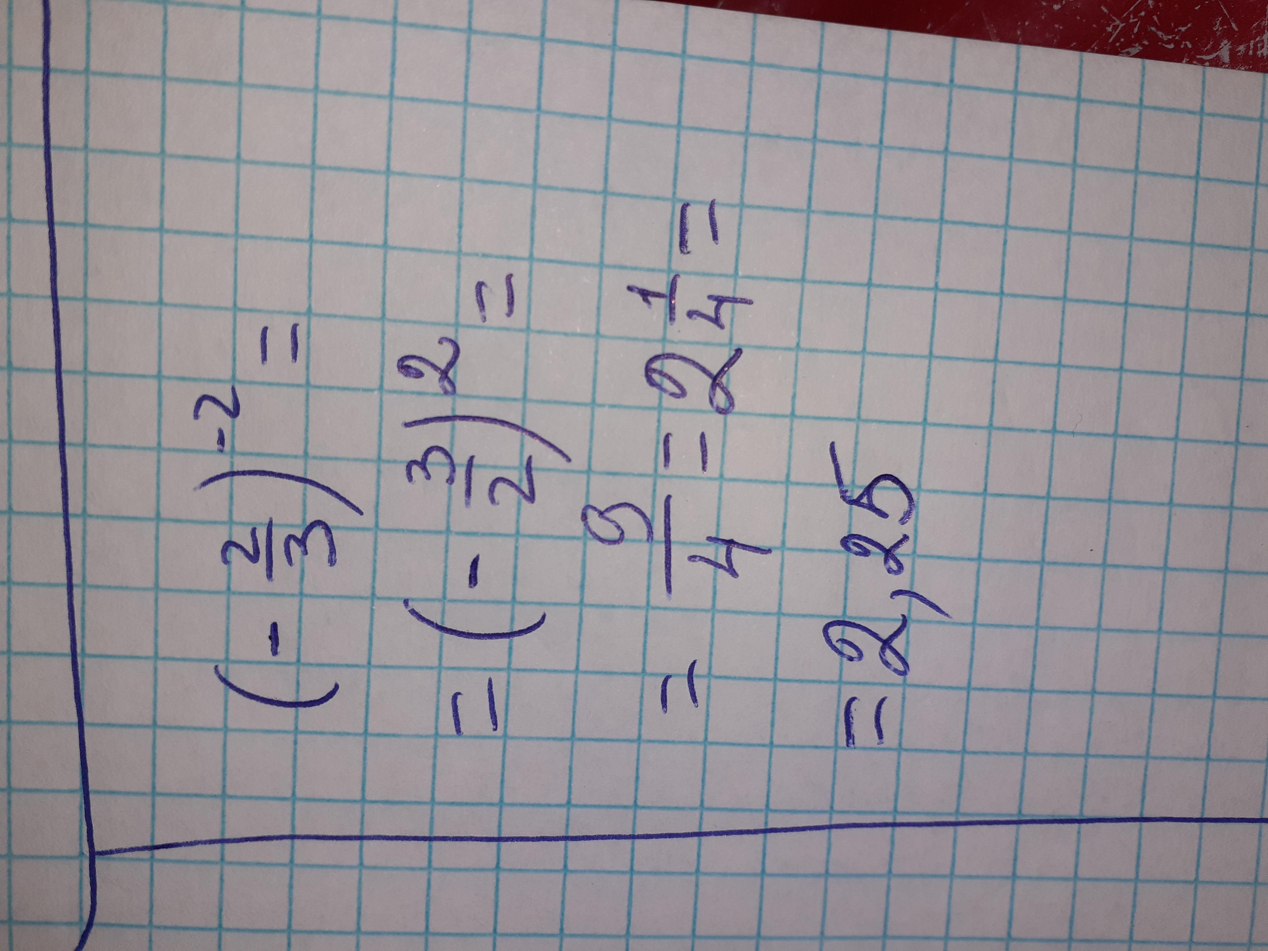 (-2/3)^-2= (-3/2)^2=(3/2)^2=9/4=2,25