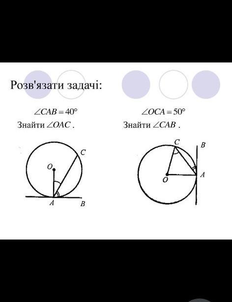 1) OAC = 90-40=50, 2) CAB = 90-50=40