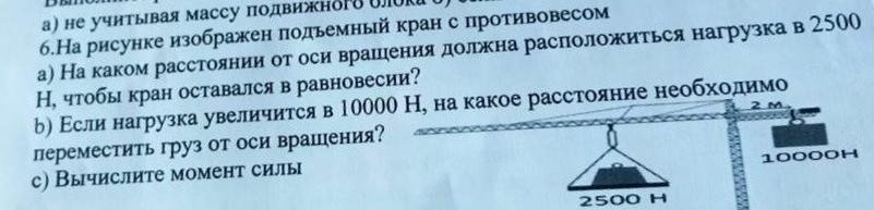 6.На рисунке изображен подъемный кран с противовесом а) На каком расстоянии от оси вращения должна расположиться нагрузка в 2500 Н, чтобы кран оставался в равновесии? b) Если нагрузка увеличится в 10000 Н, на какое расстояние необходимо 2. М переместить груз от оси вращения? с) Вычислите момент силы 10000Н 2500 H