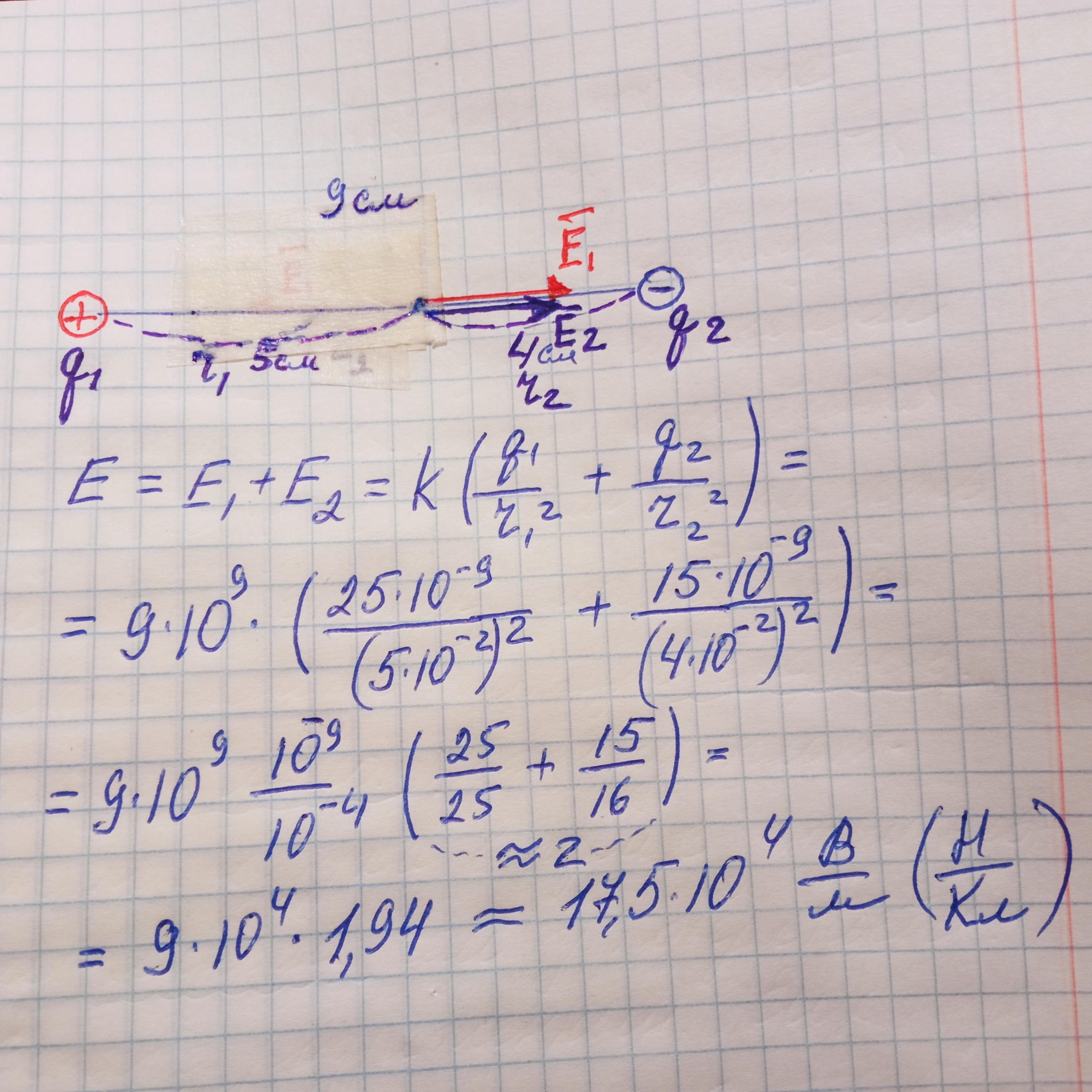 (СРОЧНО, ДАЮ 100 Б) Каковы напряженность и потенциал точки, расположенной в 5 см от заряда +25 нКл и в 4 см от заряда -15 нКл? Расстояние между зарядами 9см.