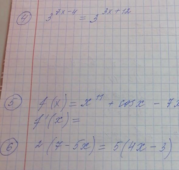 в четвёртом нужно отбросить тройки и решать уравнение со степенями: 7x-4=3x+12
