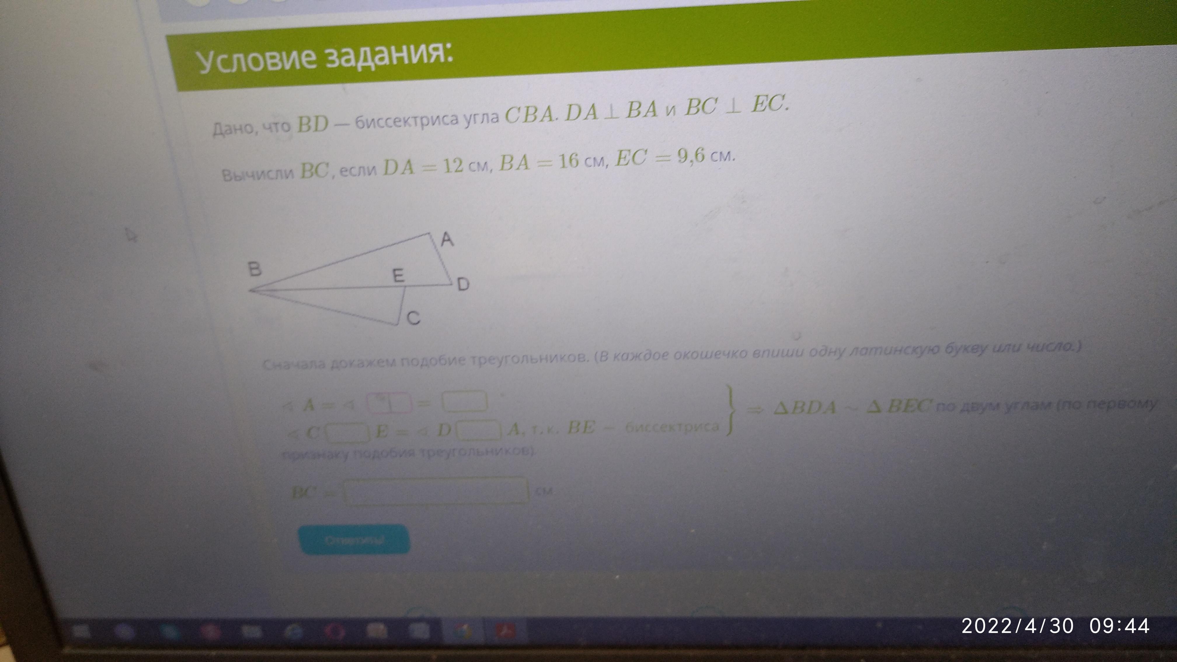BC = ( 9,6 * 16 )/12 = 12,8 ( см ) ; ВС = 12,8 см .