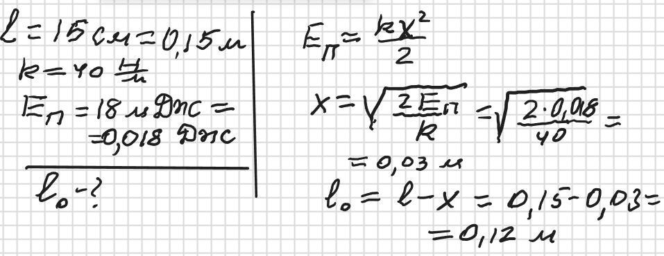 Розтягнута пружина довжиною 15 см і жорсткістю 40 H/м потенціальну енергію 18 мДж. Яку довжину має недеформована пружина?