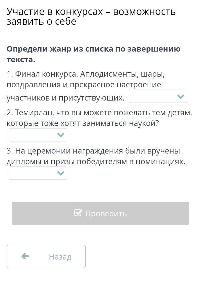 Участие в конкурсах – возможность заявить о себе Определи жанр из списка по завершению текста. 1. Финал конкурса. Аплодисменты, шары, поздравления и прекрасное настроение участников и присутствующих. 2. Темирлан, что вы можете пожелать тем детям, которые тоже хотят заниматься наукой? 3. На церемонии награждения были вручены Дипломы и призы победителям в номинациях. Проверить Назад