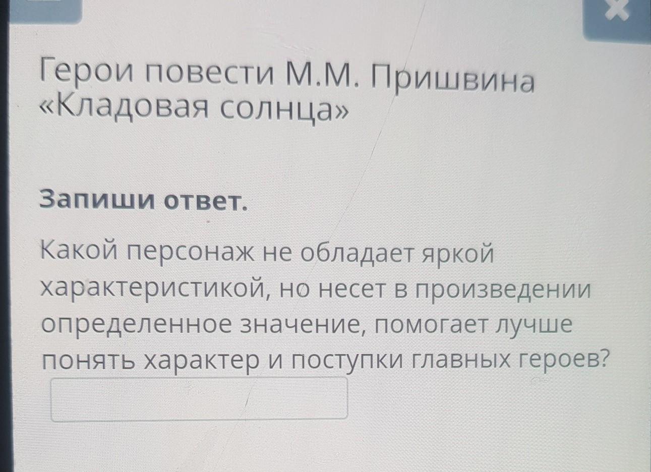 Герои повести М.М. Пришвина «Кладовая солнца» Запиши ответ. Какой персонаж не обладает яркой характеристикой, но несет в произведении определенное значение, помогает лучше понять характер и поступки главных героев?